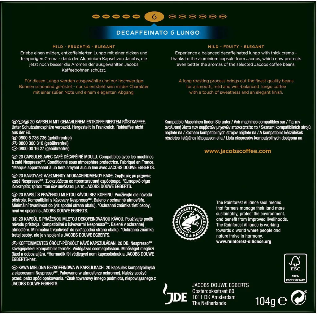 - 1 x JACOBS Kapseln Decaffeinato 6 Lungo à 20 Nespresso®* kompatible Kaffeekapseln