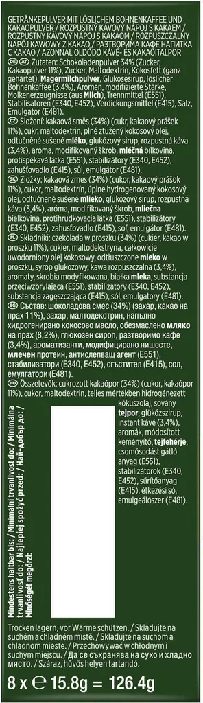 - Getränkepulver mit löslichem Bohnenkaffee und Kakaopulver.