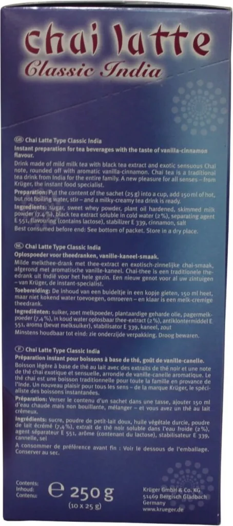 Zutaten: Zucker, Süßmolkenpulver, Kokosfett, Magermilchpulver (7,4%), Schwarztee-Extrakt kaltwasserlöslich (2,0%), Aromen (enthalten Milch), Stabilisator: Natriumphosphate, Zimt, Salz.