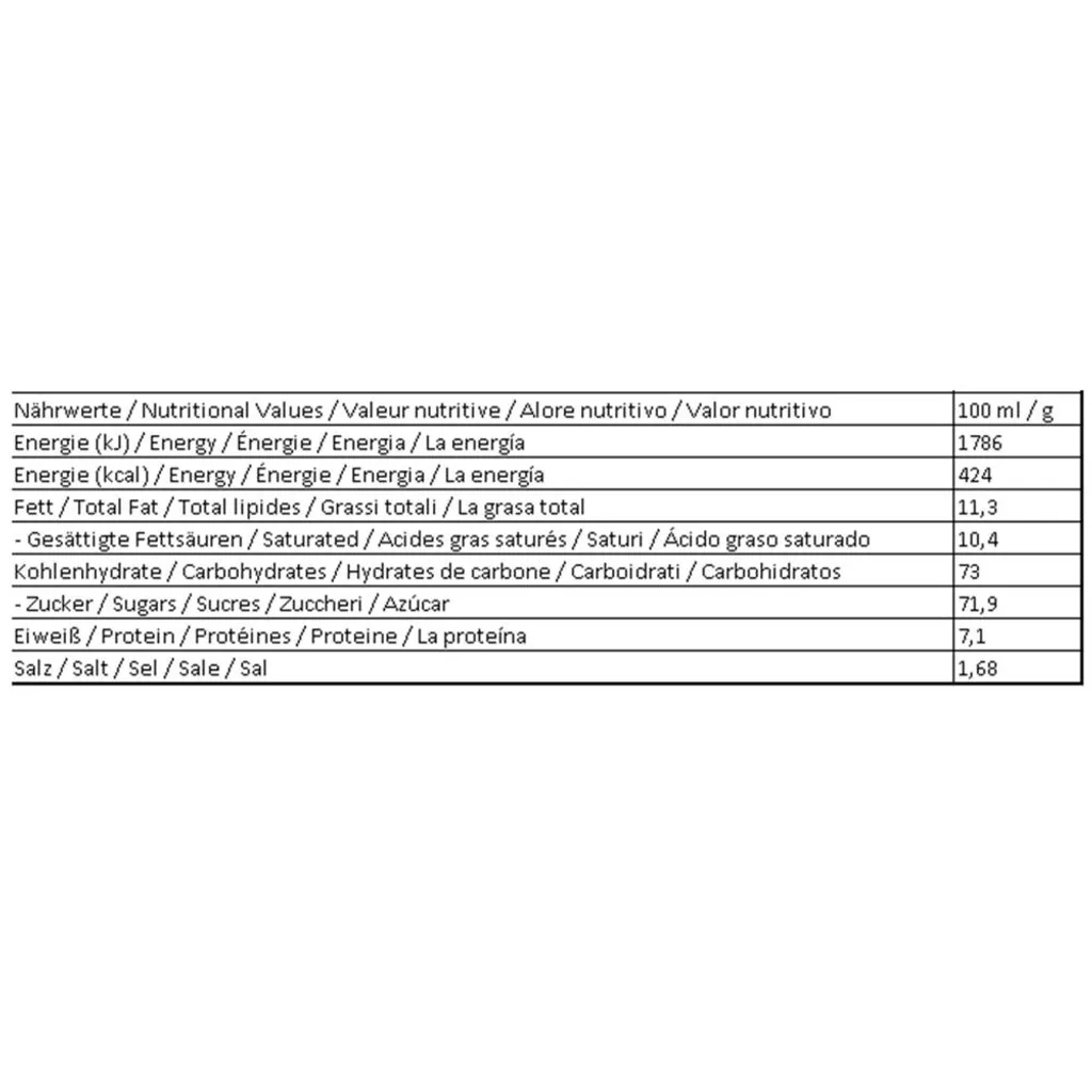 Durchschnittliche Nährwerte pro 100g: Energie 1786kJ/424kcal, Fett 11,3g, davon gesättigte Fettsäuren 10,4g, Kohlenhydrate 73,0g, davon Zucker 71,9g, Eiweiß 7,1g, Salz 1,68g