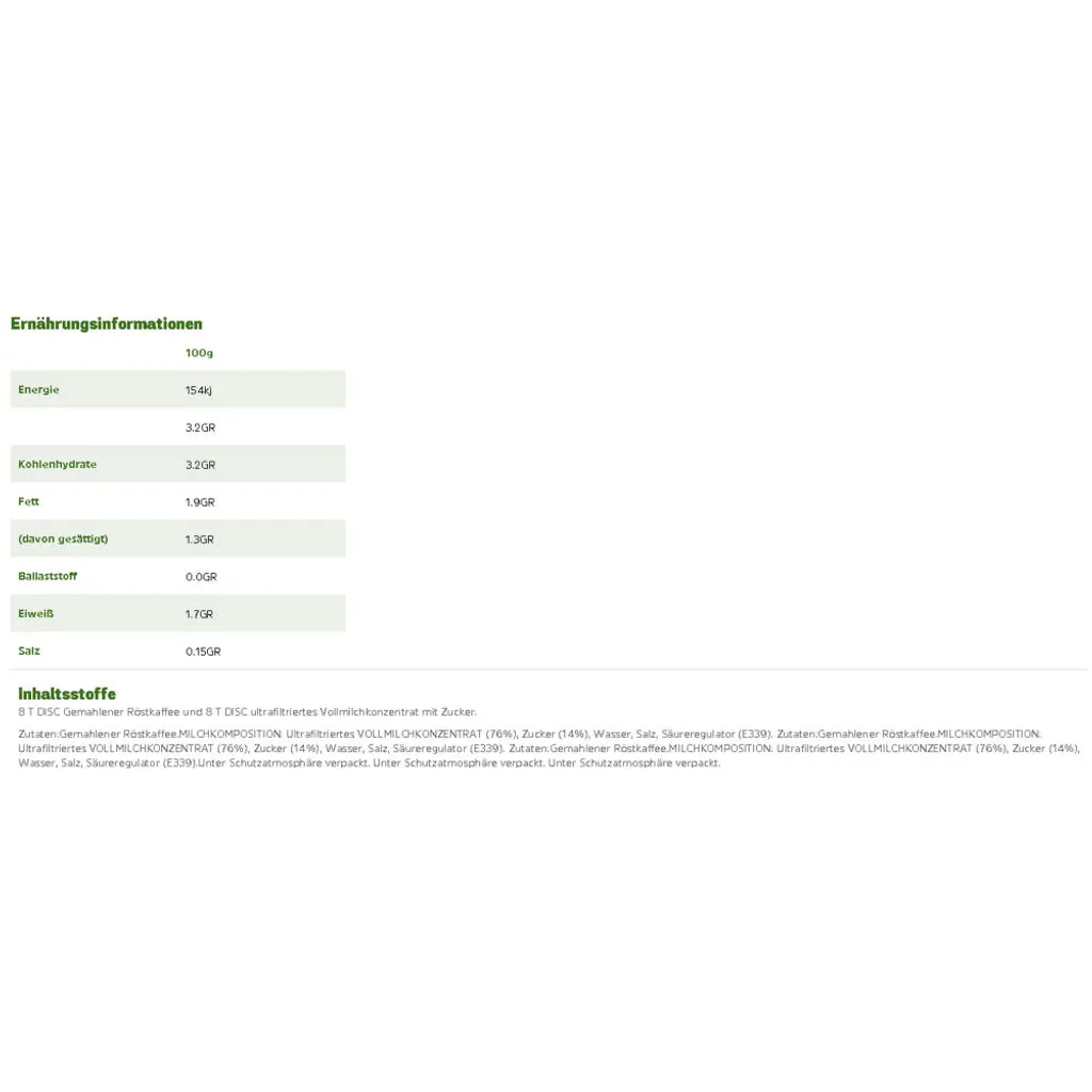 - 8 T DISCs gemahlener Röstkaffee und 8 T DISCs ultrafiltriertes Vollmilchkonzentrat mit Zucker für kaffeehaltiges Getränk.