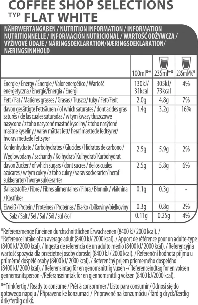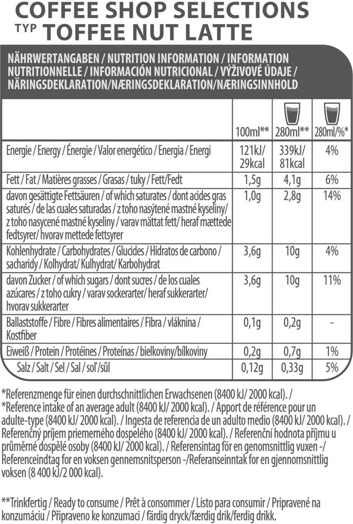 - Zutaten: Sahne (aus MILCH) (30%), Zucker, gemahlener Röstkaffee (21%), Wasser, MILCHPROTEINE, MILCHMINERALIEN, Salz, Aromen, Verdickungsmittel (E414), Säureregulator (E331)
