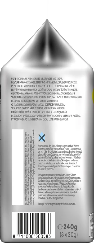 Inhaltsstoffe:Zucker, Magermilchpulver (22%), Vollmilchpulver, Fettarmes Kakaopulver (9%), Glukosesirup, Süßmolkepulver (aus Milch), Kokosfett (ganz gehärtet), Salz, Aromen, Milchproteine, Stabilisator (E340), Trennmittel (E551), Emulgatoren (E471, E433, Sojalecithin).